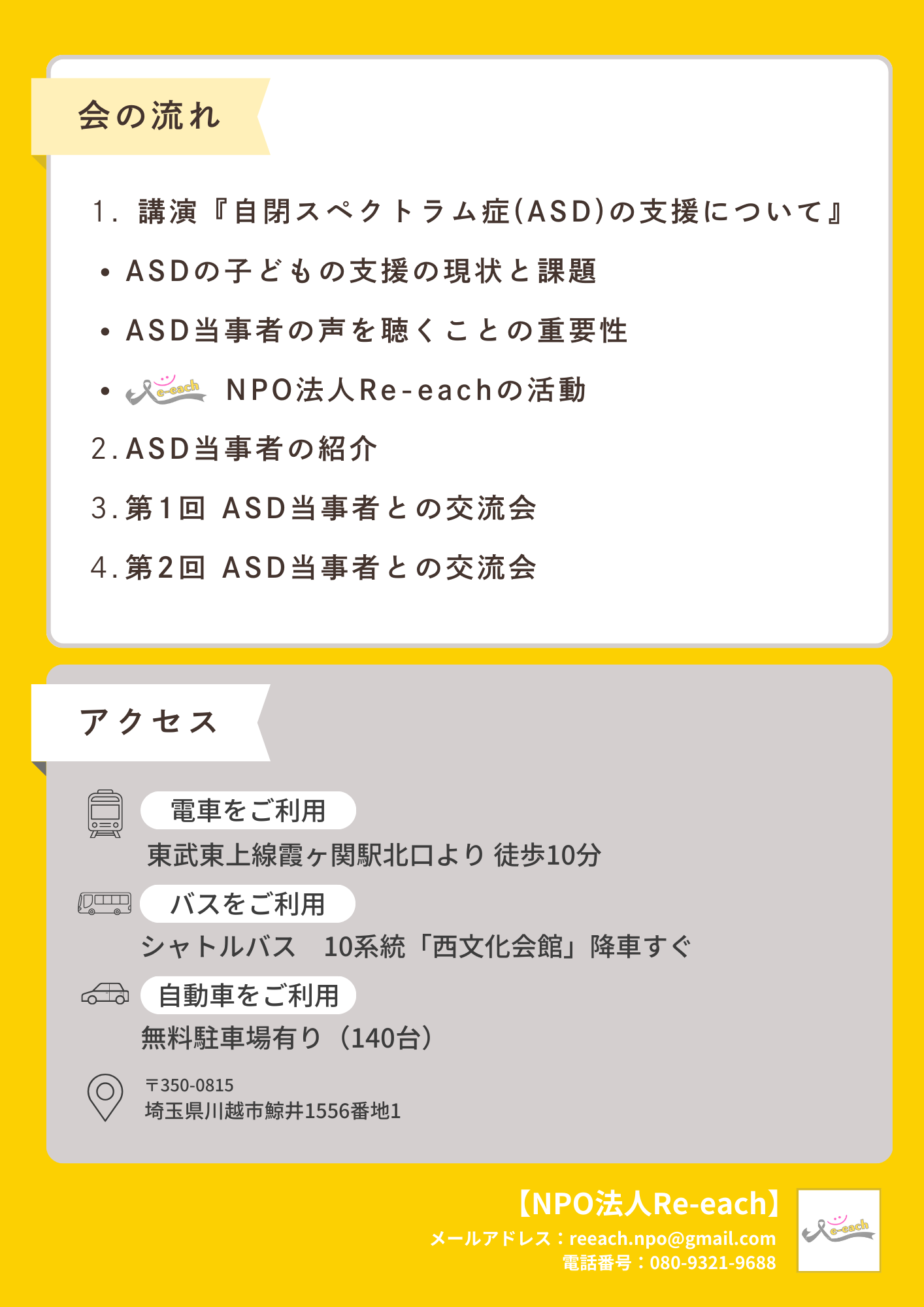 NPO法人Re-eachは、11/30(日)に埼玉県川越市にあります「川越西文化会館」をお借りして【自閉スペクトラム症(ASD)の理解を深める交流・勉強会】を開催いたします。