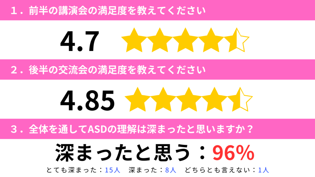参加者23名の方にアンケートの回答を頂きました。