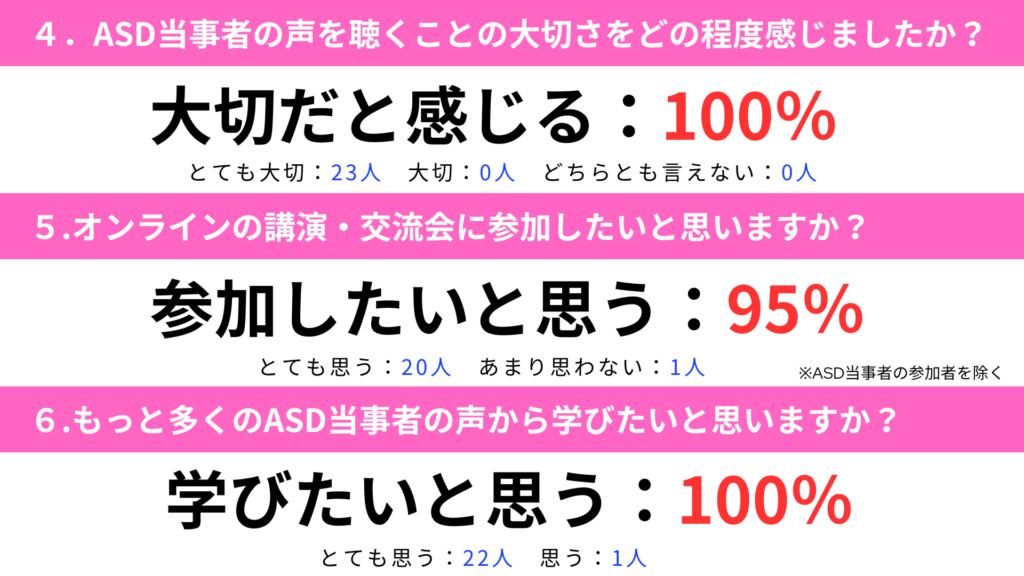 それなりに自閉症について勉強してきたつもりだったが、当事者の話を聞く事で改めて知らなかった事を知ることができました。貴重なお話を聞けて有難かったです。