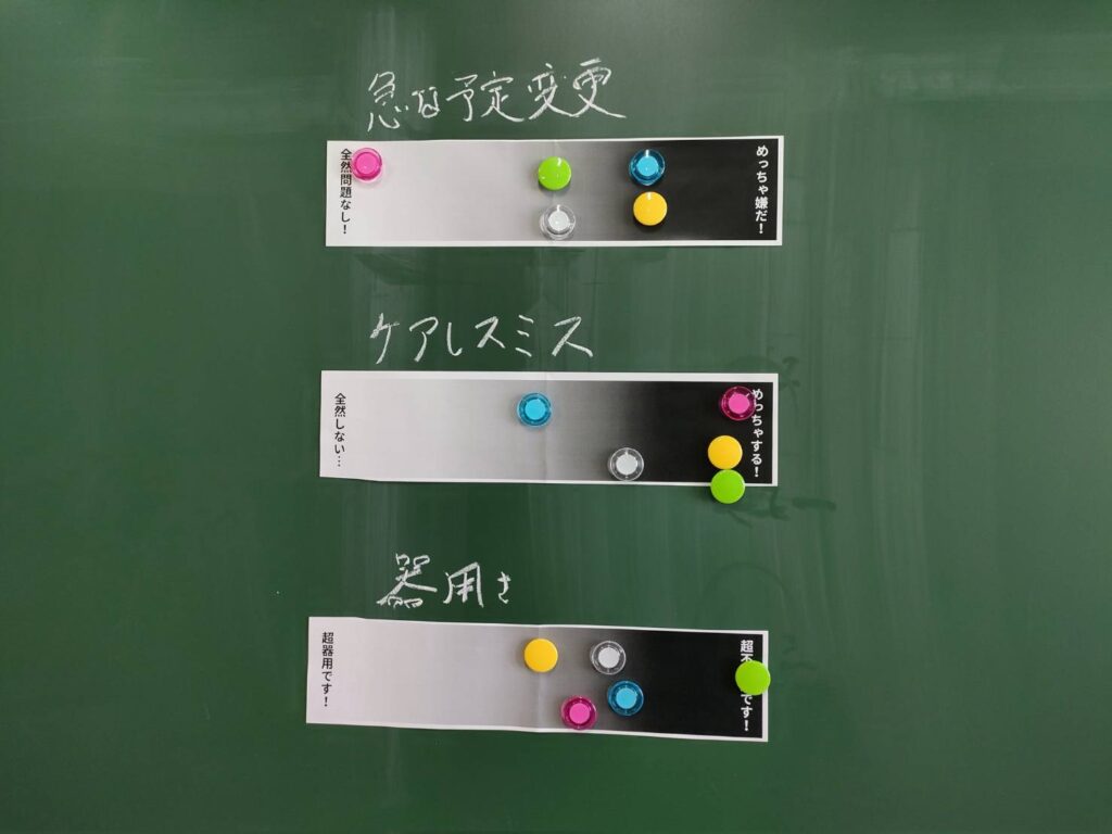 下にある色がグラデーションになった紙に自身の特性(感覚)はどの辺りに位置するかをまずは決めていただきました。