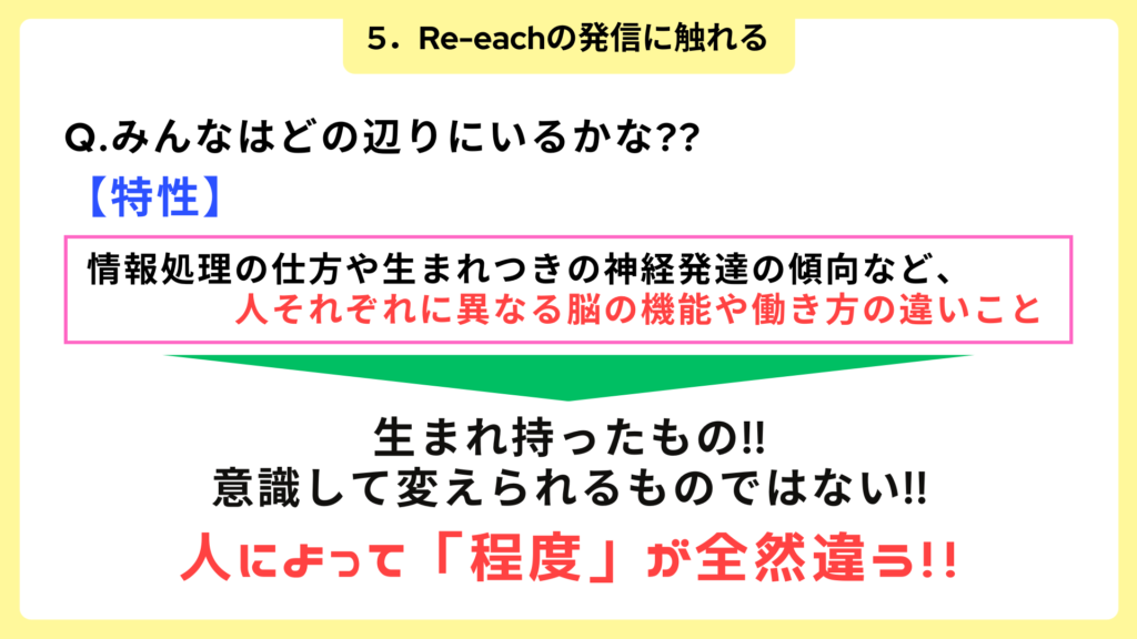 今回、NPO法人Re-eachとしては初めて社会に出る前の子どもたちを対象に発達障害(神経発達症)のお話をさせていただくことができました。